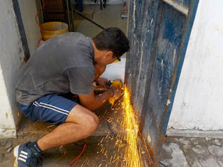 Não se pratica só caiaque no CCC. Além dos treinos técnicos de remada e segurança, também se estuda navegação, normas marítimas, meteorologia... Mas ainda não é tudo. Pra manter o clube funcionando, a gente precisa saber fazer mais. Fim de semana passado teve sessão de serralheria com Roberto Milita e Flávio Violante que chegaram na Urca com muita disposição pra consertar as portas do box. Tive que registrar.
