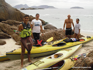 Saímos do Rio sexta à noite pra pernoitar na casa do Gustavo em Muriqui. Os carros foram deixados no final de uma estrada, daí seguimos 200 metros pela linha do trem carregando as tralhas. Antes de dormir, tomamos umas pingas e preparamos o Caiaque do Daniel que precisava de umas alças para as amarras de convés. Essa parte foi resolvida satisfatóriamente usando durepoxi.