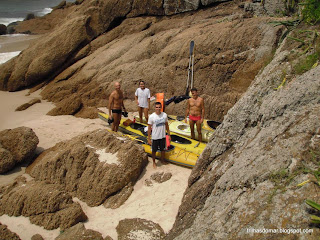 Esperei um pouco e desembarquei sem percalços. Edu veio depois e foi varrido por uma onda lateral, capotando já na beira. Em seguida vieram Ana e Spock. Também viraram na aterragem meio catastrófica. O caiaque ficou ao sabor das ondas se arrastando pesado na areia. Depois de um tempo lutando conseguimos tirar a água e levar o bicho pra longe da arrebentação. Daniel chegou tranquilo, escolheu um bom momento e aterrou sem dificuldade.